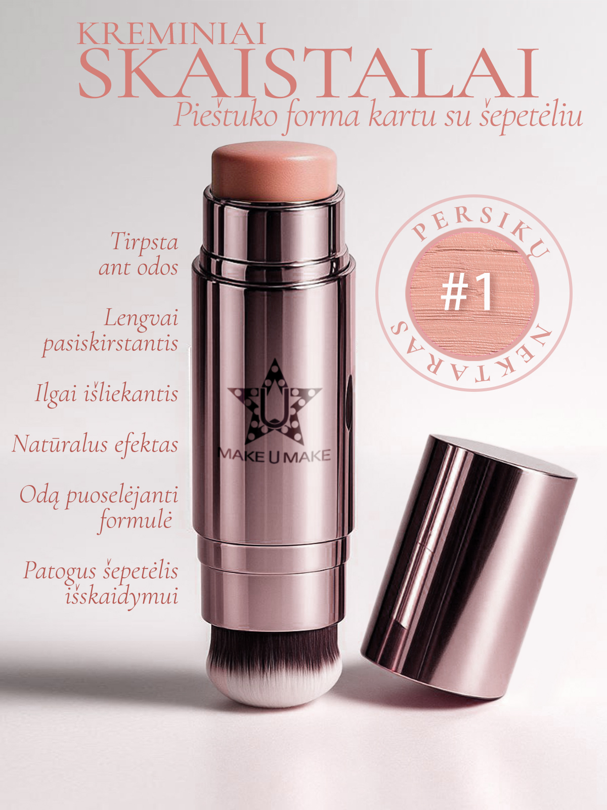 3. Daugiafunkcinė magija – kreminė tekstūra lengvai pasiskirsto šepetėliu, pabrėžiant skruostikaulius. Galima naudoti kaip skaistalus, šešėlius ar lengvą atspalvį ant lūpų – viena lazdelė, begalė įvaizdžių.