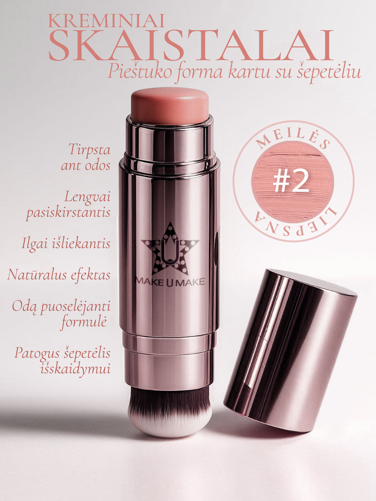 3. Daugiafunkcinė magija – kreminė tekstūra lengvai pasiskirsto šepetėliu, pabrėžiant skruostikaulius. Galima naudoti kaip skaistalus, šešėlius ar lengvą atspalvį ant lūpų – viena lazdelė, begalė įvaizdžių.