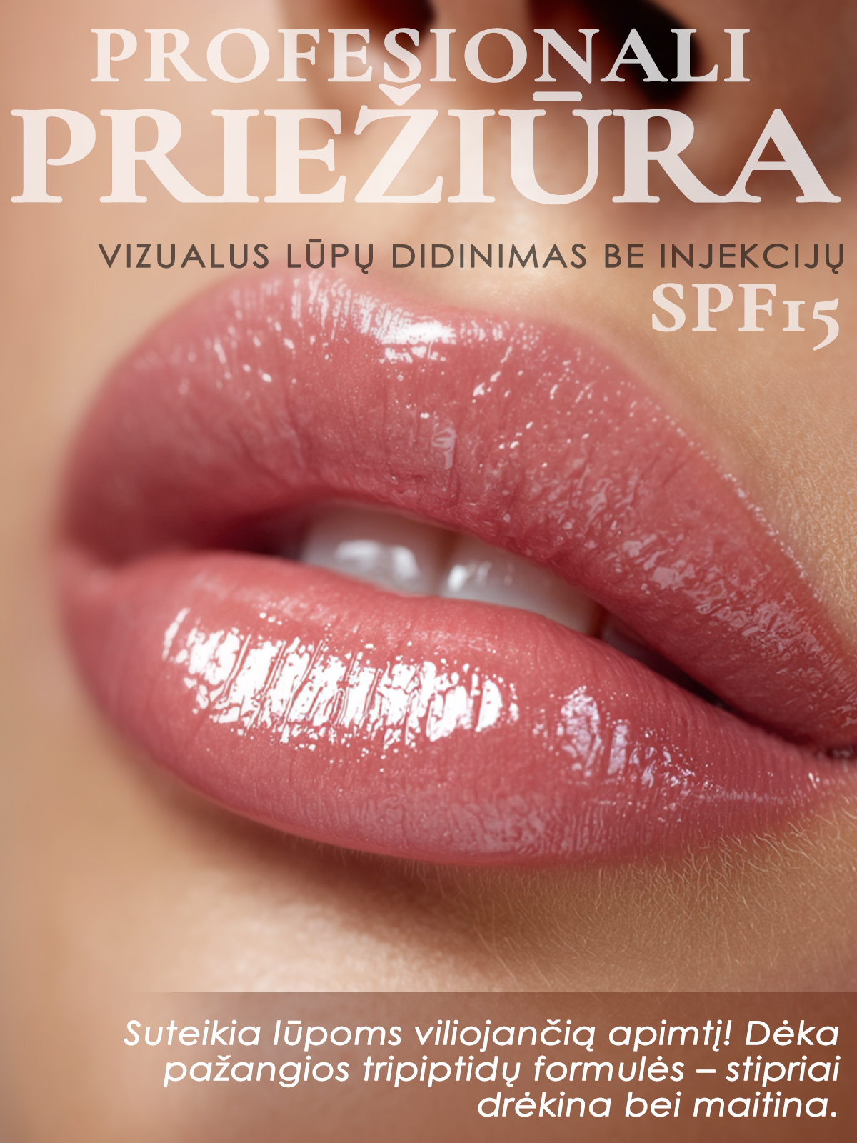 Drėkinantis lūpų pieštukas–plamperis–blizgis su tripeptidais ir SPF.